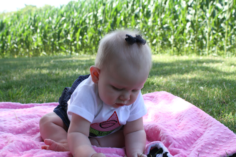 Mommy thought it would be fun to take my six month picture....outside when it's HOT and I have pnemonia! I didn't feel like similing!F